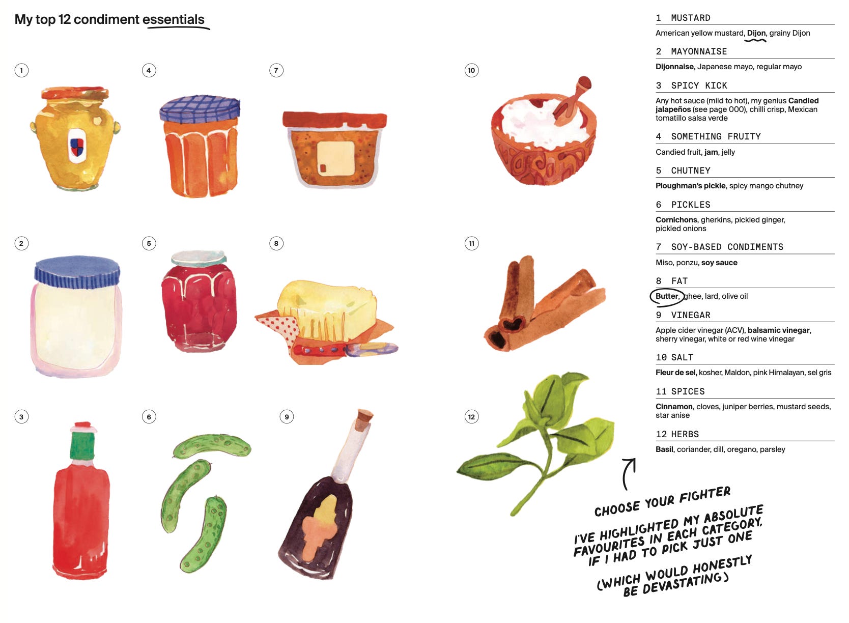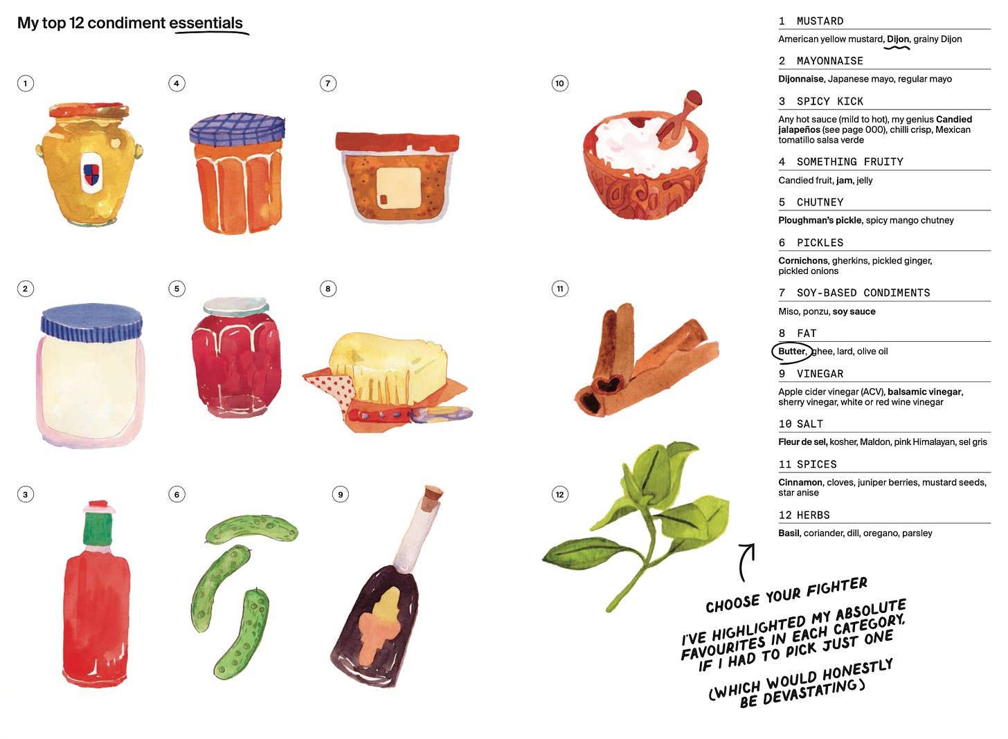 You may remember a similar page from The Condiment Book! You don’t need these all, but I wanted to share the overarching categories with you all. I’ve bolded my current faves of the bunch if I could only pick one (scary).